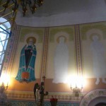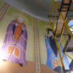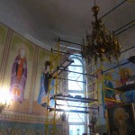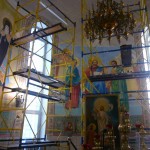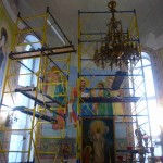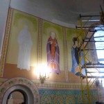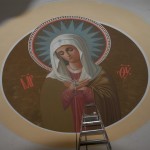 Иркутский художник — иконописец продолжает работу над написанием в главном куполе храма иконы Божией Матери «Умиление», а зеленогорские художники продолжают роспись стен в алтарной части.